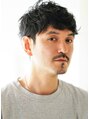 サイドと襟足は浅めに2ブロックに。骨格を見極めて絶妙なバランスを作る。スライドカットで動きとニュアンスを作ることで外国人っぽい質感を作ります。ピンパーマでランダムに巻いてラフっぽさを出します。骨格が良く見えるように巻きます。