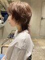 ニュアンスウルフ。フロントにニュアンスを残しながら短く作って程よくパーマをあてたウルフスタイル。ピンク味を少し持たせたブラウンベージュでさらに軽さをプラスしました。