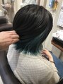 インナーカラーをブリーチではっきりグリーンをONトップは暗めグレージュカットは切りっぱなしボブで