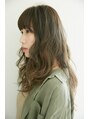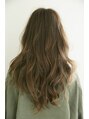 ヘアカラーは暗めのダークブラウンに、透明感が出るようにヴァイオレットをまぜたカラーリング。室内では暗く、太陽光に当たると明るく透明感が出やすくなっています。全体的にウェーブになるようにスタイリングして、束間を出しています。