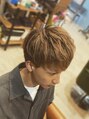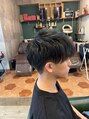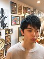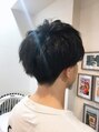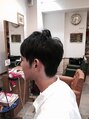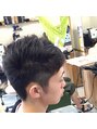 ○サイドは斜めにブロックを入れ納まりが良いように刈り上げ!○フロントはまぶたの真ん中に設定しカット○バックの刈り上げはグラデーションに下から上に向かって刈り上げ○上の髪はかぶせていくスタイル○トップは動きがゆるくでるように少し長めにカット