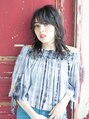 アッシュ系の落ち着いたカラーリングのウルフスタイルです。カラーを落ち着いた色にすることで派手ではないナチュラルな可愛らしいスタイリングになります。暗い色で重く見えがちなので毛先を巻く事で重く見えない動きのあるデザインになります。【稲毛】