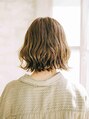 あご下の長めボブ。バングの幅は短めで今どきバングに!スタイリングは毛先が外はねになるよう波ウェーブでまいています。