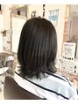 赤みを抑えたナチュラルトーンのアッシュ系カラーです。ロングからミディアムにばっさりとカット。量が多く硬い髪質で重たい印象に見え易いので、毛量調整をきちんとしてあります。丸顔なのでフェイスラインを包む様にし、ほんのりレイヤーを入れてあります。
