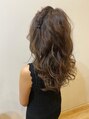 ロングのコテ巻きサイドにはねじりとくるりんぱでデザインを入れています
