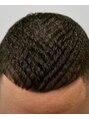 周りはハイスキンフェードにし、トップをアイロンパーマがかけられるほどに残す。立ちやすい髪質を濡れパン(濡れた状態にアイロンパーマ)をすることで髪の毛が寝たスタイルにできる。