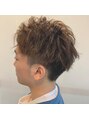 サイドをツーブロック。さらにバックまでを繋げて、馴染むように刈り上げをして、アップバングになるようにカット。束感を出すように毛量を調整。トップを立ち上げる部分パーマで自然な立ち上がりに。