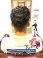 境目に太めのラインを入れて左流しのショートスパイラル。カットやパーマのロットの巻き方まで考えたスタイルです。