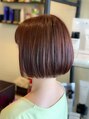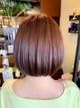 あごラインのナチュラルボブのベースに淡い紫をミックスしたピンクカラーで暖色系でも重くならず透明感のあるスタイルに★