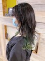 地毛を活かして、インナー部分だけ1回ブリーチ後、マニキュアでグリーンを重ねました。顔周りを短く切り込んだロングウルフ。結んでも、顔周りの後れ毛がかわいいデザインです。モード・ストリート・人と違ったスタイルが好きな方に。