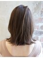 カットは方につく長さでワンカール内巻きにしたり、外ハネにしたりといろいろ楽しめる長さです!毛先を外ハネにし前髪をかきあげバングで大人っぽくすることで丸顔や髪が広がりやすい方にもオススメです!カラーも柔らかさの出るヌーディベージュです!