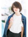 健康的な黒髪ショートは、アシンメトリーなヘアアレンジでぐっとオシャレにフェミニンに。長めの斜めバングで目元をチラ見せしてアンニュイな表情に見せ、サイドの前下がりラインで輪郭カバーして小顔に仕上げます。男女問わず好感度大のアシメショート。