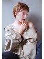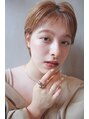大人のお洒落感!シースルーバングで顔まわりを明るく見せつつ、上品さのあるタイトシルエットなショートに。温かみのあるほんのりオレンジベージュ。