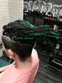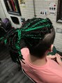 エクステブレイズです。黒ベースに緑をアクセントとしてポイントでつけさせていただきました。長さは1つにまとめれる長さで調節しています。おろすと、だいたい肩につくくらいの長さです。