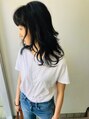 黒髪を重く見せないウルフレイヤー。高い位置からレイヤーを入れ、キメ凄ないゆるボサ感がポイント。あえて黒髪で作ることいにより、子供っぽさがなく大人のカジュアル感が楽しめます。