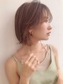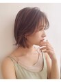 切りっぱなしあご下レイヤー。ぱつんとしたラインでカット。前髪はシースルーバング。エヌドットカラーのフォギーベージュでツヤ感のある色味に◎軽く外ハネに巻き、オイルをつけて完成◎