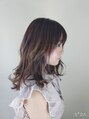 ブリーチなしでカラー履歴を利用したバレイヤージュです。カットは毛先を軽くしたローレイヤーです。外はねでルーズに巻いて仕上げました。