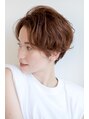 カットで自然な丸みをつけたドライだけでも収まるショートスタイル。カラーはオレンジベージュでツヤと程よいカジュアル感を。前髪は長めに残してあるのでアップバングにも下ろして流してもOK。