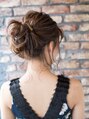 ツイストアップをラフに見せたない大人のアップスタイル。2段に分けてまとめているので、毛先にボリュームを出しやすく、さらにトップにはボリュームを出してバランスの取れたスタイルに。襟足、サイドに後れ毛を出し、大人っぽいスタイルに。【稲毛】