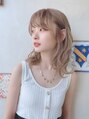 ブリーチ1から2回/髪質によってその後、黄色味を抑えながら淡くブレンドしたベージュをオン。前髪を2段に分けて巻く事でフワッと涼しげに見えます。毛先は32ミリのコテで外巻きに出来た外ハネの上の段を内巻きに。仕上げにオイルを馴染ませて。