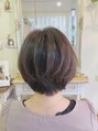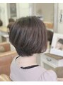 前下がりショートボブ!襟足スッキリ、トップは軽く柔らかい雰囲気に!カラーはグレーアッシュで透明感をプラス!また、パーマを毛先だけ当たるだけで乾かすだけでできちゃう簡単スタイリング!大人女性に大人気スタイル!