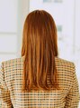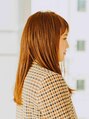 透け感のある明るめのオレンジカラーでツヤっぽく見せました。 全体はワンレンベースで顔まわりに少しだけレイヤーを入れてカットします。バングはシャギーを入れて斜めに流せるようにカットします。