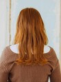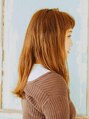 切りっぱなしのミディアムスタイル。ノンレイヤーでタイトなIラインシルエットをショートバングで抜け感を作っています。カラーはオレンジ系のカジュアルな印象に仕上げています。