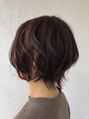 夏~秋に重く見えないショートスタイル。ハイライトの発色や立体感を出す為、ハイライトを入れてからカラーON。ピンクベースに、落ち葉の様なラセットブラウンをMIX。毛量が多くクセがある為、毛量調整をしっかりし動きが出る程度にレイヤーを入れてあります