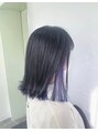 切りっぱなしミディアムヘア。インナーカラーに鮮やかな紫陽花カラー、トップには暗めのアッシュグレージュを入れます。チラ見えするパープルカラーが可愛いスタイルです。