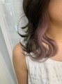 元々全体ブリーチしてある髪を表面は、暗めのアッシュベージュで染めインナーカラーをペールピンクで染めたデザインカラーです。インナーカラーを目立たせるために表面を暗くし髪を下ろしても毛先にチラッと見えるようにレイヤーカットをしています!