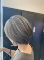 透明感たっぷりのグレージュになります。ケアブリーチでツヤツヤなベースをつくりあげて、派手になりすぎない落ち着きのある色にしあげました。