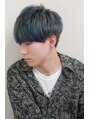 カットは耳周りをスッキリして軽めに襟足を刈り上げたソフトマッシュです。そのベースに一度ブリーチをした後、ブルーマットを入れポイントでランダムな範囲に散るように濃いブルーを入れています!個性と立体感が欲しい方にオススメです♪