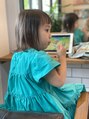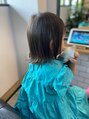 キッズカット。おろしてても、くくってもかわいい長さ。外ハネスタイル。前髪は短め。おでこ半分くらい。