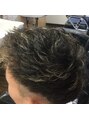 カラーは細めのメッシュが入っており、トップにはツイストパーマが。サイドはフェードスタイルのツーブロックでバックも同じく短く刈り上がっております。グリース系のワックスを乗せればモテヘアーの完成です。