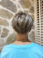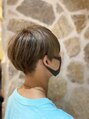 サイド2ブロック、襟足刈り上げのマッシュスタイル。カラーはブリーチ履歴有りのお客様なので、ハイトーンのベージュをオンカラー。