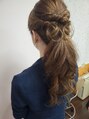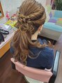 トップは少しふんわりさせて、ボリュームだして。サイドはねじりながらバランスのよい位置で。まとめてあとは大きめのカール。