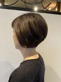 前下がりラインのショートボブ。あまりかたさがでないよう軽く動きがでるようにしました。カラーは白髪染めですが、モノトーングレー系の色味で透明感をだしました。