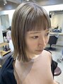 ハイトーンのミディアムボブ。カットラインを残すように毛量調整し、前髪はオン眉ラインでぶつ切りに。ベージュ系のハイトーンカラーにフィットしたスタイルです。