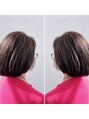 大人女性にも遊び心^ ^凄くも目立たないハイライト、全体の色味はアッシュ系をいれて柔らかく透明感のある色味に仕上げています。喜んでもらえてええ感じ!カットは見えにくいですがマッシュベースのアシンメトリーのボブです!