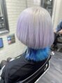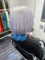 もともと明るい髪色の方でしたので、根元ブリーチリタッチしたのちに、インナーを寒色系3色(青、ターコイズブルー、水色)に、上を白にしました。カットでクラゲウルフに仕上げました。