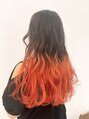 毛先はブリーチ2回にオレンジカラーをオン!上のベースはダークチョコレートカラーで透明感のあるブラウンに!
