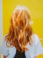 ヘアカラーはオレンジカラーにしています。スタイリングは、太めのコテを使って全体的にウェーブ感が出るように巻いています。前髪をかきあげると大人っぽい雰囲気を出すことができます。