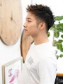 サイドと襟足は2ミリスタートの刈り上げ。トップは上に立ち上がるように短くカット。センターに集まるようにワックスを付けて完成。