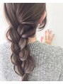 耳後ろから襟足を少しポイントでブリーチをして、うすいラベンダーグレーでカラーしています。ストレートにおろせば隠すこともできて、巻いたりアレンジするとチラッと見えます。全体はグレージュでクールすぎず落ち着いたカラーです。