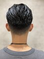 自然で頭の形がきれいにみえるよう刈り上げ、オールバックスタイルで流れをつくったビジネススタイル