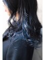 お仕事でデザインカラーが出来ない方にガッツりインナーではなくポイントでメッシュをいれることでくくると隠せるスタイルです。ブルーブラックをいれることいより透けると透明感が強くなり、嫌な赤み、オレンジが無く色落ちしていきます。