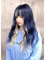 ブリーチ+カラーでネイビーブルーにカラーしてからシールエクステもネイビーブルーにカラーしてインナーと前髪はホワイトのエクステを付けてロングスタイルにしました。地毛の長さは肩までの長さからシールエクステ90枚でヘソ上ロングに。
