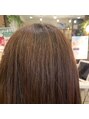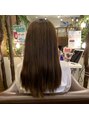癖を伸ばすことももちろんですが、ビジュアル的に気になる表面のフワフワした毛も優しくまとめあげる優しい縮毛矯正です。矯正特有の毛先の硬さもなく、しなやかで艶感を感じる仕上がりです。