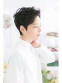 好感度大の黒髪ショート。ニュアンスパーマで全体的にボリュームをつけ、トップはふわっと立ち上げてスタイルアップ効果。アップバングにすることで重くなり過ぎず、爽やかな男前スタイルに。ビジネスシーンではオールバックにイメチェンもカッコイイ!