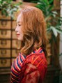 センターで分けた髪の毛を全体的に26ミリのコテを使ってウェーブ巻き、毛先は外になるように巻いて前髪は外巻きにします。オレンジ系のカラーで。